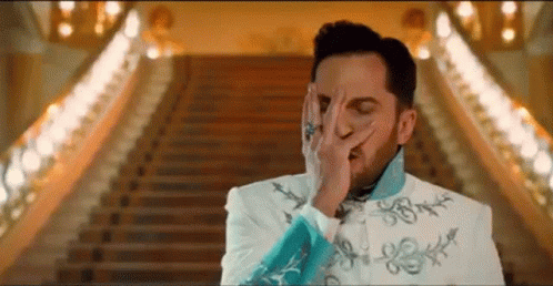 Aleksandr Revva, as Arthur Pirozhkov, covers his face in a white suit in front of a grand staircase, from his music video 'Низачто Почему'.