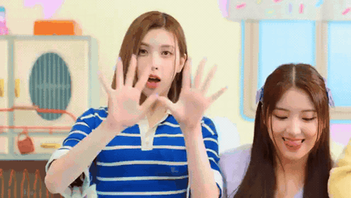 two girls are sitting next to each other in a room and one of them is making a stop sign with her hands .