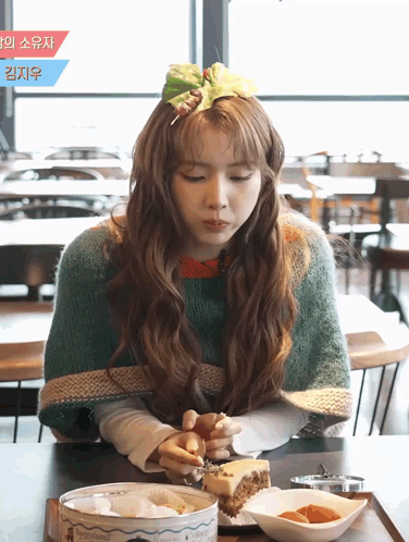Nmixx Jiwoo enjoys a delicious dessert, expressing her delight with a happy reaction in a cafe.