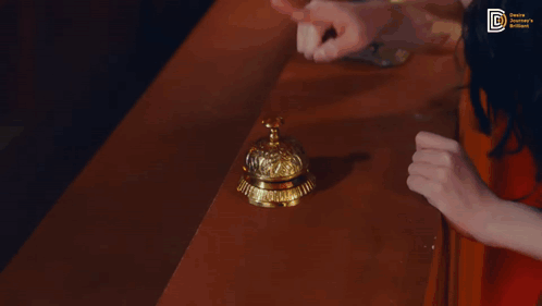 Nmixx's Kyujin rings a golden hotel bell on a wooden counter, looking around curiously.