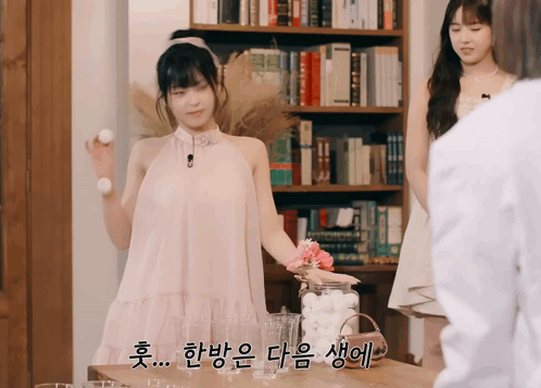 a woman in a pink dress holds two balls in her hand in front of a bookshelf