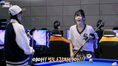 a woman holding a pool cue next to a woman wearing a sox jersey