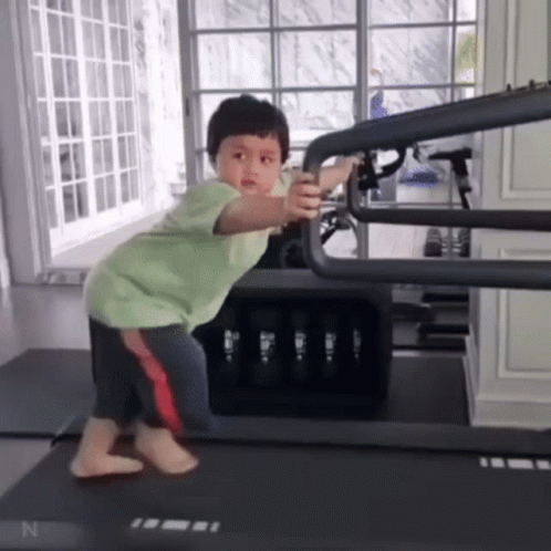 A little boy, Nnumting, is seen walking on a treadmill while holding onto the front railing for support.