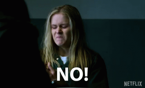 Erin Moriarty, wearing a green uniform, shouts 'NO!' with an angry and upset expression, from a Netflix production.