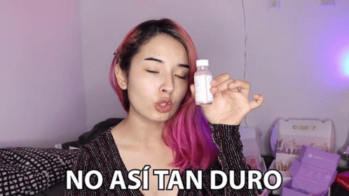 Laura Sanchez, a woman with pink hair, holds a bottle and says "No así tan duro" (Not so hard).