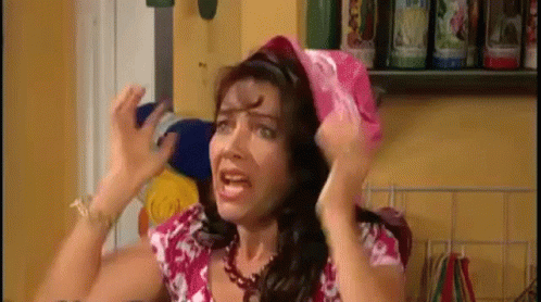 Mara Escalante as Maria de Todos los Angeles, wearing a pink hat and making a funny face while holding her hair.