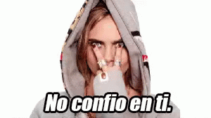 A woman in a grey hoodie with the text 'No confío en ti' (I don't trust you) overlaid, looking directly at the camera.