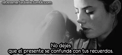A black and white clip featuring the Spanish quote 'No dejes que el presente se confunda con tus recuerdos' over a woman's face.