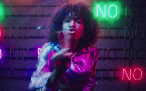 Woman in purple jacket dancing in front of a neon 'NO' sign.