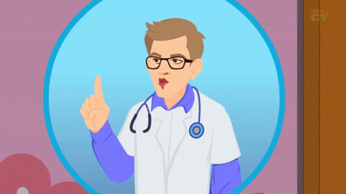 Animated doctor in glasses and stethoscope shakes head, points finger, conveying 'No, don't do that.' From Kids TV.