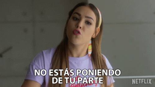 Lucrecia Montesinos Hendrich (Danna Paola) from Elite tells someone they're not doing their part in a purple shirt.