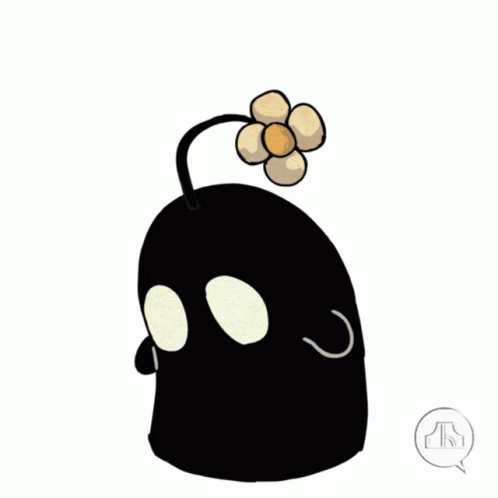 A black blob-like cartoon character with a flower on its head expresses confusion with question marks.