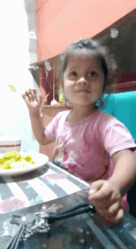 A little girl with a pink shirt smiles at the camera while sitting at a table with a plate of green food.