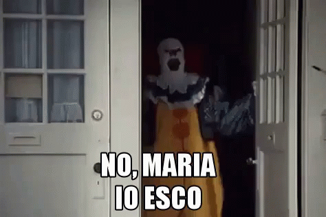 A scary clown appears in a doorway with the Italian phrase 'No, Maria I'm leaving,' referencing the Tina Cipollari meme.