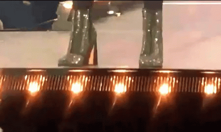 Miriam RodrÃguez performs on stage, showcasing her high-heeled boots during a concert, possibly making a strong impact.