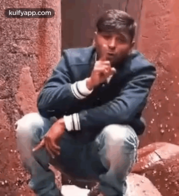 A man squatting and making a 'no' gesture with his finger to his lips, then shaking his head.