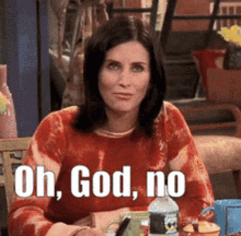 Monica Geller, played by Courteney Cox, expresses disagreement with 'Nope, no, no' and 'No' captions.