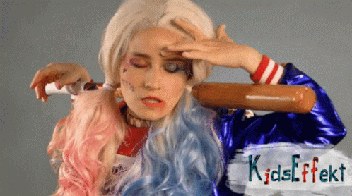 Harley Quinn reacts with a headache, looking stressed and overwhelmed while holding a baseball bat.