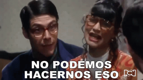Beatriz Aurora Pinzon and Nicolás Mora from 'Yo soy Betty, la fea' in a tense moment, saying 'No podemos hacernos eso'.