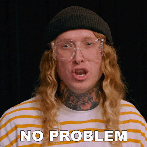 Bobby, from Ink Master, reacts with 'No Problem' while wearing a beanie and clear glasses.