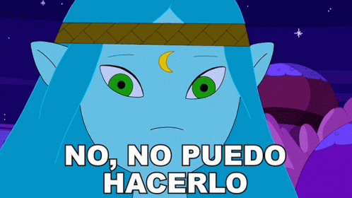 A blue-skinned character from Hora De Aventura (Adventure Time) says 'No, no puedo hacerlo'.