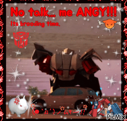 Megatron is in a brooding mood, declaring 'No talk me ANGY!!!' in this meme-style image.
