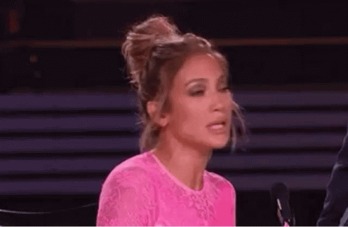 J Lo in a pink dress, making a 'No Way Right' expression with a shrug while sitting in front of a microphone.