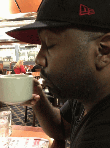 A man in a black hat sips from a white cup, conveying a 'no words, no comment' reaction.
