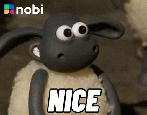A cartoon sheep from Nobi App gives a thumbs up with 'NICE' text.