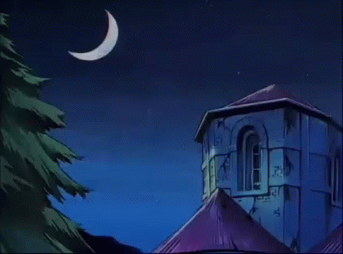 An animated scene of an old castle tower with a purple roof under a crescent moon at night.