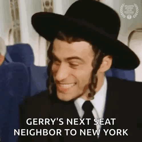 Gerry's next seat neighbor from 'The Mad Adventures of Rabbi Jacob' smiles and nods on a flight to New York.
