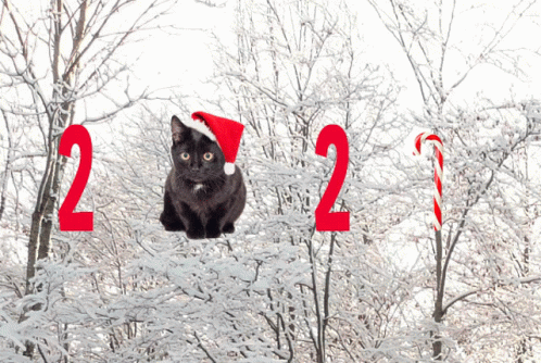 ChloéTocabens' black cat wearing a Santa hat in a snowy winter scene with the numbers '2' and '2' and a candy cane.