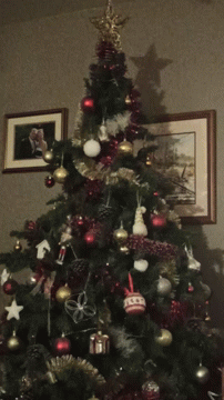 Beautifully decorated Christmas tree adorned with red, gold, and white ornaments, sparkling with blinking lights.