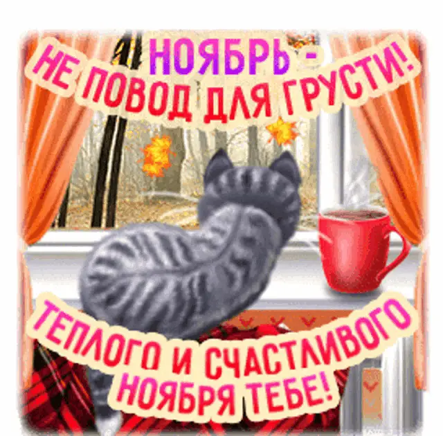 Animated graphic with a coffee cup, heart latte art, red rose, and Russian text: 'May November be warm and cozy!'