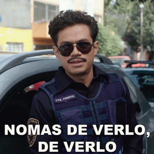 A man in sunglasses and a police vest with 'TTE. PRIETO' text, saying 'Nomas de verlo, de verlo'.