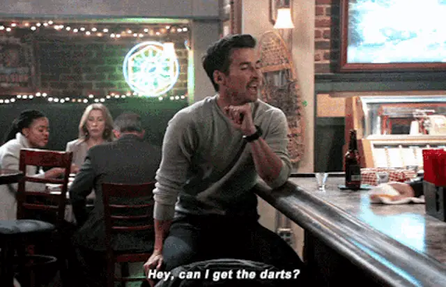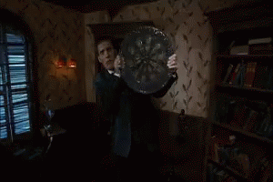 Lurch from the Addams Family, wearing a tuxedo, looks confused while holding a large dartboard.