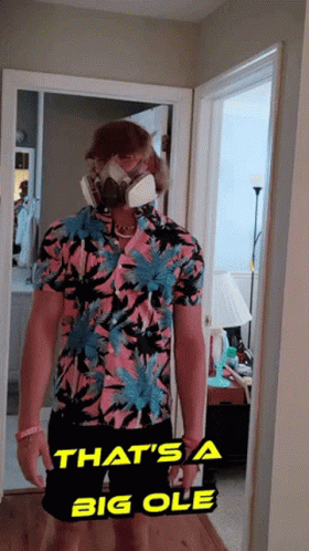A man in a gas mask and Hawaiian shirt stands as text overlays 'THAT'S A BIG OLE NEGATIVO NO'.