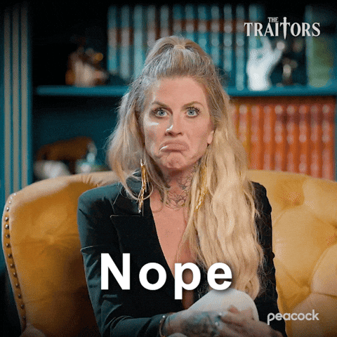 Carolyn Wiger from The Traitors US shaking her head 'Nope' while sitting on a yellow couch.