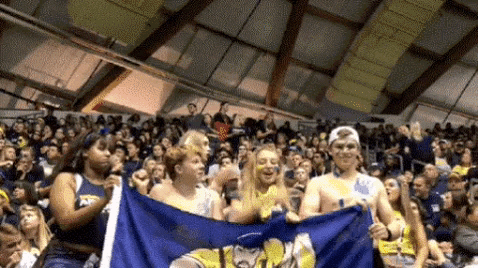 a group of people are standing in a stadium holding a flag .
