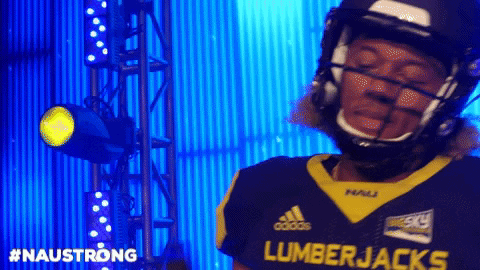 a football player wearing a lumberjacks jersey stands in front of a blue wall