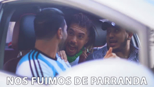Three men in a car, one wearing an Argentina jersey, ready for a night out, with the caption "NOS FUIMOS DE PARRANDA".