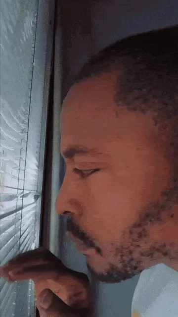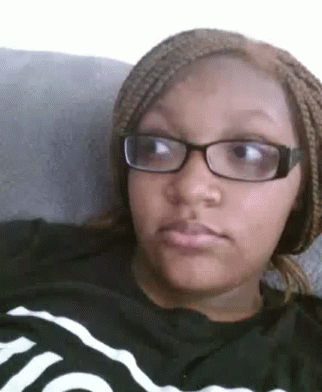 A woman with braided hair and glasses makes a funny, puckering face while looking to the side on a couch.