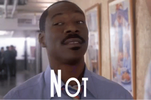 Eddie Murphy in a blue shirt, with the word 'Not' superimposed on the screen, conveying disagreement.