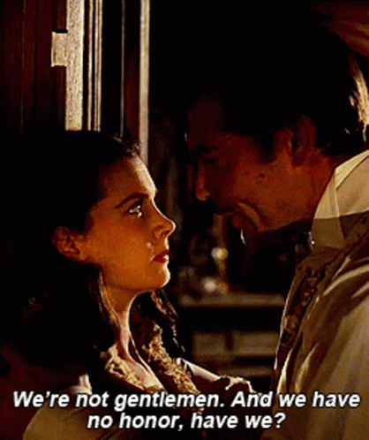 Rhett Butler and Scarlett O'Hara in a tense moment from Gone With The Wind, discussing honor.