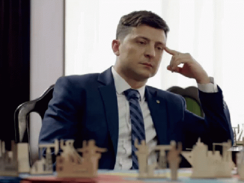 Volodymyr Zelenskyy looks thoughtful and serious, sitting at a table with a chess board.