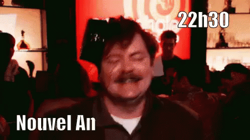 Ron Swanson celebrating New Year's Eve at 10:30 PM, making a funny face and dancing.