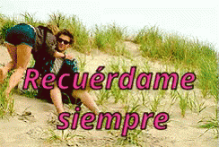 Robert Patterson and a woman relax on a sandy dune with green grass, overlaid with the text 'Recuérdame siempre'.