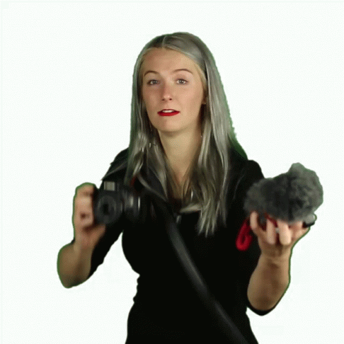 A woman with gray hair, holding a camera and microphone, poses as a Novy Start photographer.