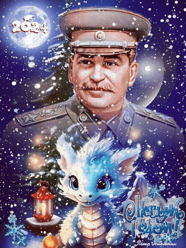 Stalin depicted in a festive New Year 2024 scene with a cute dragon, surrounded by snow and a Christmas tree.