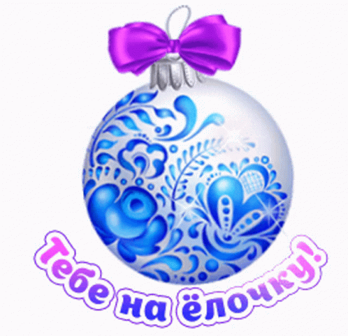 A festive blue and white Christmas ornament with a purple bow, featuring the Russian text 'Тебе на ёлочку!' (To your Christmas tree!).